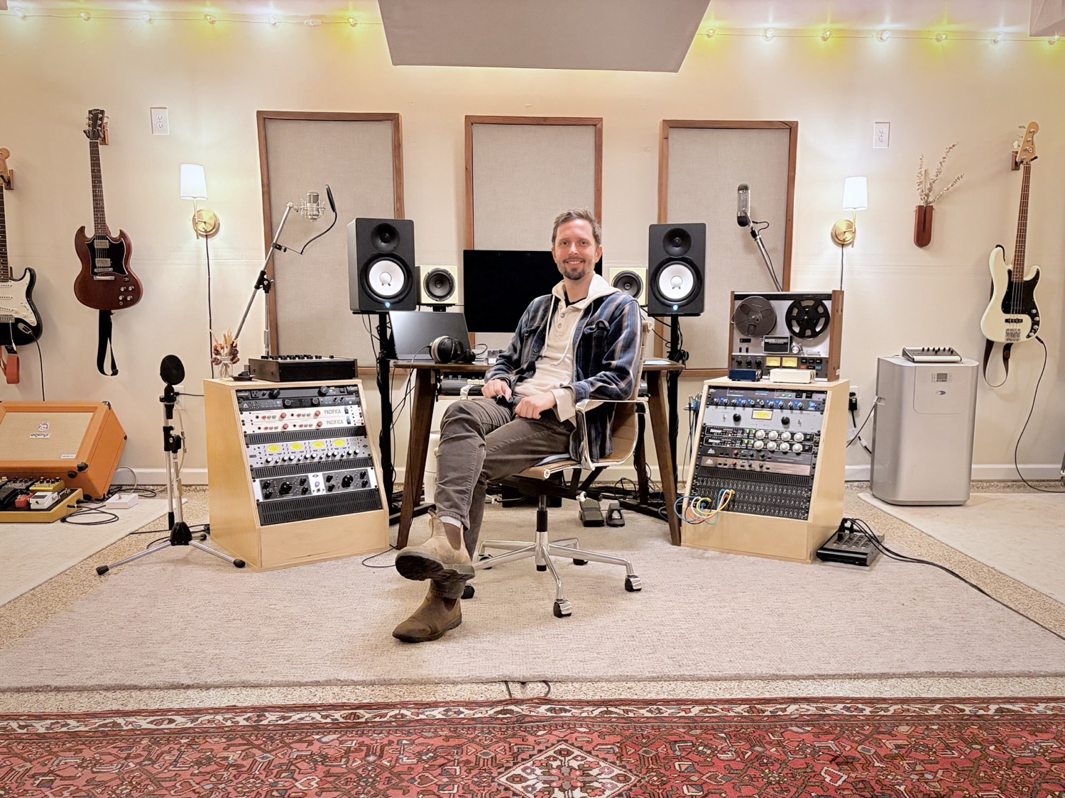 Gear is important but only a means to an end. I've collected a variety of classic instruments, amps, mics, preamps, and compressors so that we can find the perfect tone. (See my gear list below.) While I love to take the time to explore different tones, my experience enables me to select great-sounding signal chains from the start so that sessions can run efficiently and the emphasis can be on the music. I aim for the engineering to be invisible and run seamlessly in the background.